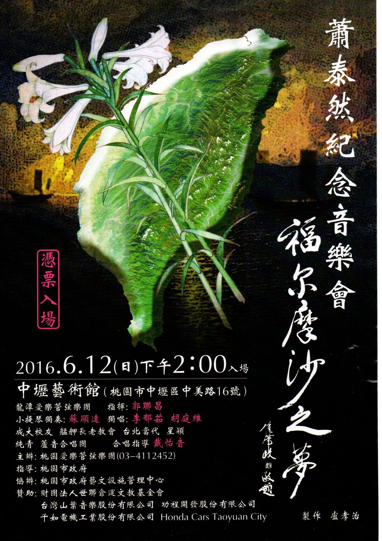 「蕭大師雖走了,但這條道路我們要繼續走下去」,「福爾摩沙之夢」音樂會已演出七場了,蕭老師走後的第一場,我們將重新出發,並且從龍潭出發。第八場「褔爾摩沙之夢<蕭泰然紀念音樂會>於2016年6月12日星期日下午2:30在中壢藝術館演出。他特地請龍潭的文學大師鍾肇政老師題字。這一場的管弦樂部分由連續4年榮獲文化部村落文化發展計畫,桃園市傑出藝文團隊。更於去年榮登國家音樂廳殿堂,的龍潭愛樂管弦樂團擔鋼。