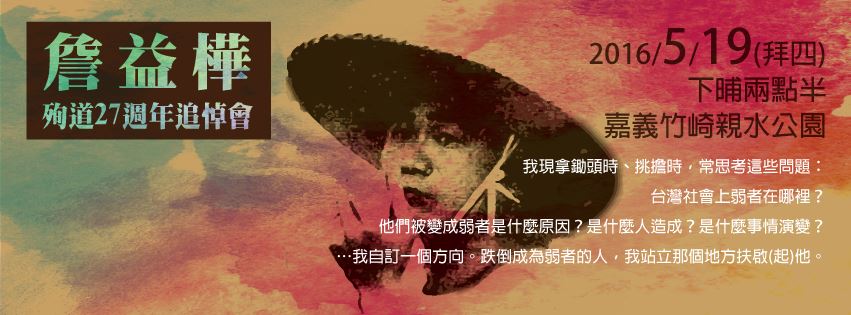 【不要忘記基層兄弟~詹益樺】2016年5月19(禮拜四)下午2點半開始,在嘉義竹崎親水公園詹益樺紀念亭,舉辦詹益樺殉道27周年追思紀念會。