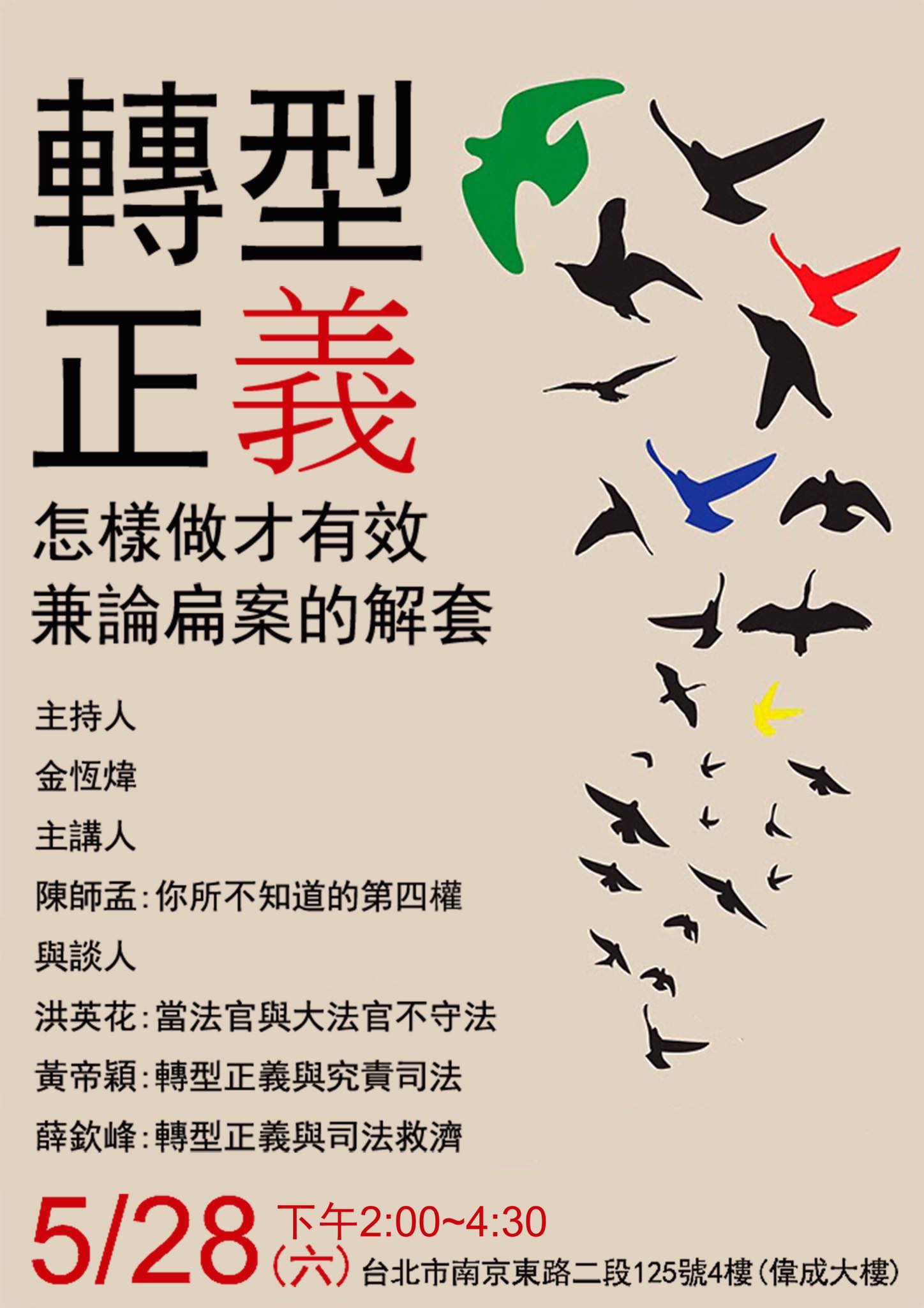 【首場座談 週六登場!】 “轉型正義”怎樣做才有效-兼論扁案的解套 主持人:金恆煒 主講人:陳師孟-你所不知道的第四權 與談人: 洪英花法官-當法官與大法官不守法 黃帝穎律師-轉型正義與咎責司法 薛欽峰律師-轉型正義與司法救濟 時間:5月28日 (六)下午2點~4點半,地點:台北市南京東路二段125號4樓(偉成大樓)