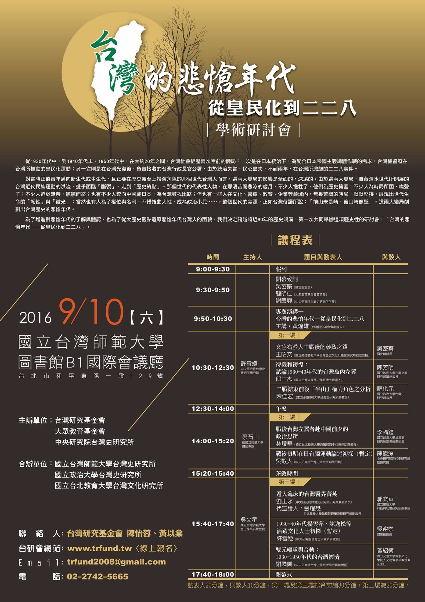 為了增進對悲愴年代的了解與體認,也為了從大歷史觀點還原悲愴年代台灣人的面貌,我們決定跨越將近80年的歷史鴻溝,第一次共同舉辦這項歷史性的研討會:「台灣的悲愴年代──從皇民化到二二八」。