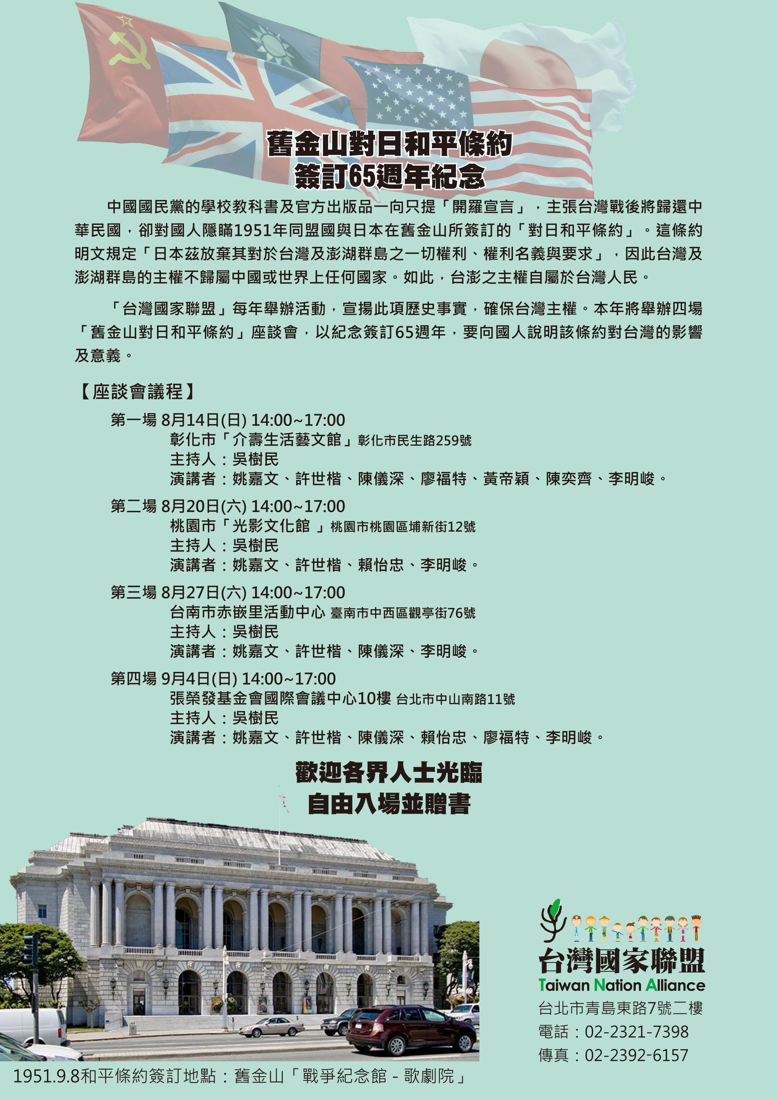 台灣國家聯盟分別舉辦四場【舊金山和約】65周年座談會