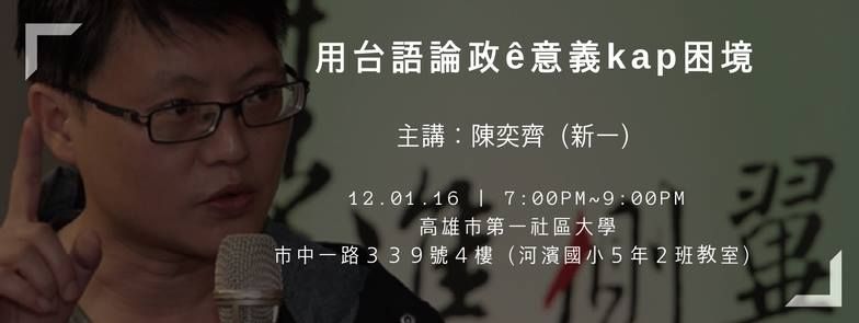 Ta̍k-ke 好,打狗台語開講社beh 舉辦第二場講座lo͘h!這pái 真榮幸thang 邀請tio̍h 基進黨黨主席-陳奕齊(新一)來kap 咱開講。伊主要是beh 分享伊所觀察--tio̍h,少年人用台語討論政治ê 狀況。基進ê 支持者大部份lóng 是少年人,nā ùi 這點來看伊是siōng 適合講這ê 主題--ê。真歡迎ta̍k-ke 做伙來討論家己對這ê 主題ê 想法喔!