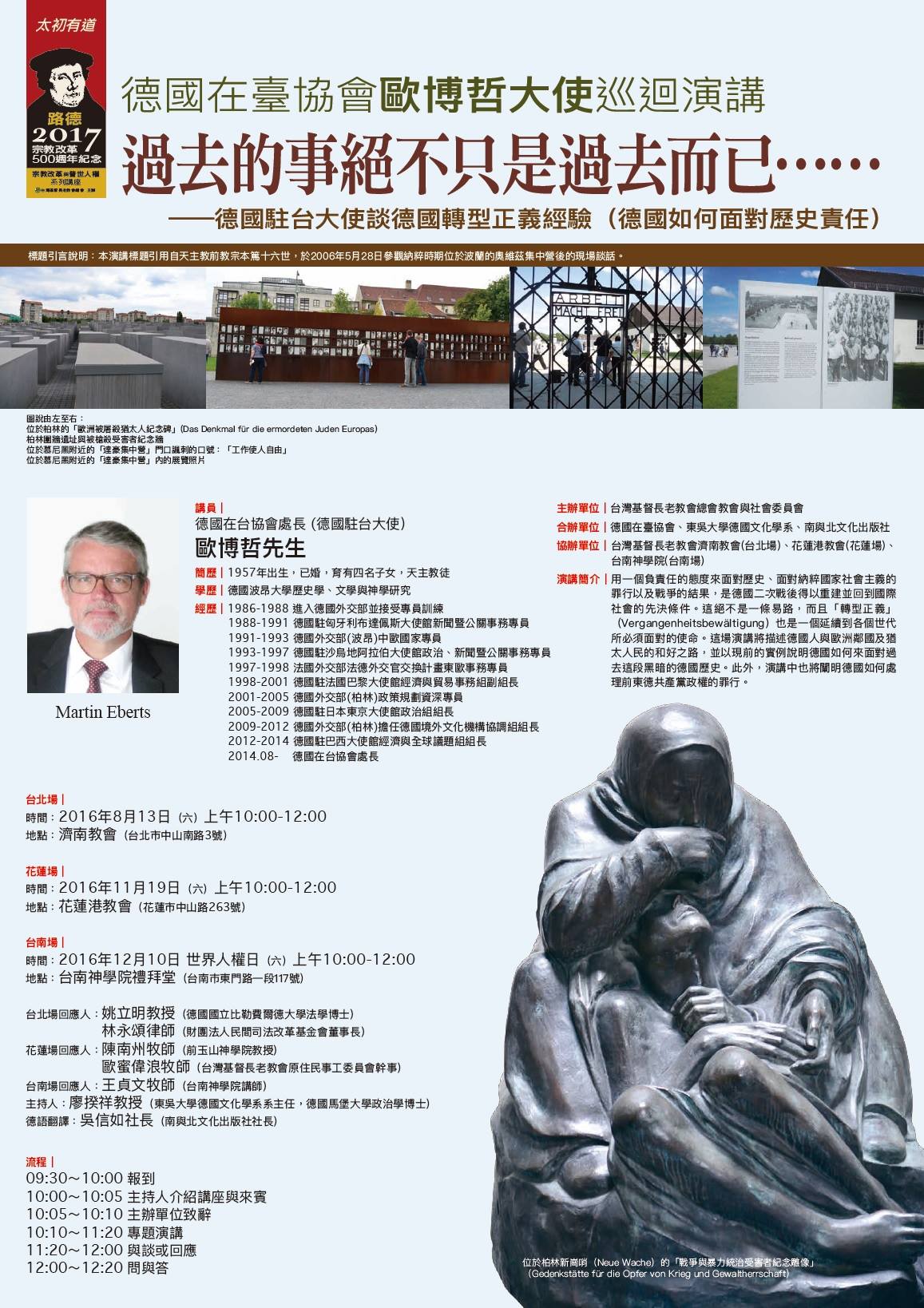 用一個負責任的態度來面對歷史、面對納粹國家社會主義的罪刑以及戰爭的結果,是德國二次戰後得以重建並回到國際社會的先決條件。這絕不是一條易路,而且「轉型正義」也是一個延續到各個世代所必須面對的使命。這場演講將描述德國人與歐洲鄰國及猶太人民的和好之路,並以現前的實例說明德國如何來面對過去這段黑暗的德國歷史。此外,演講中也將闡明德國如何處理前東德共產黨政權的罪行。