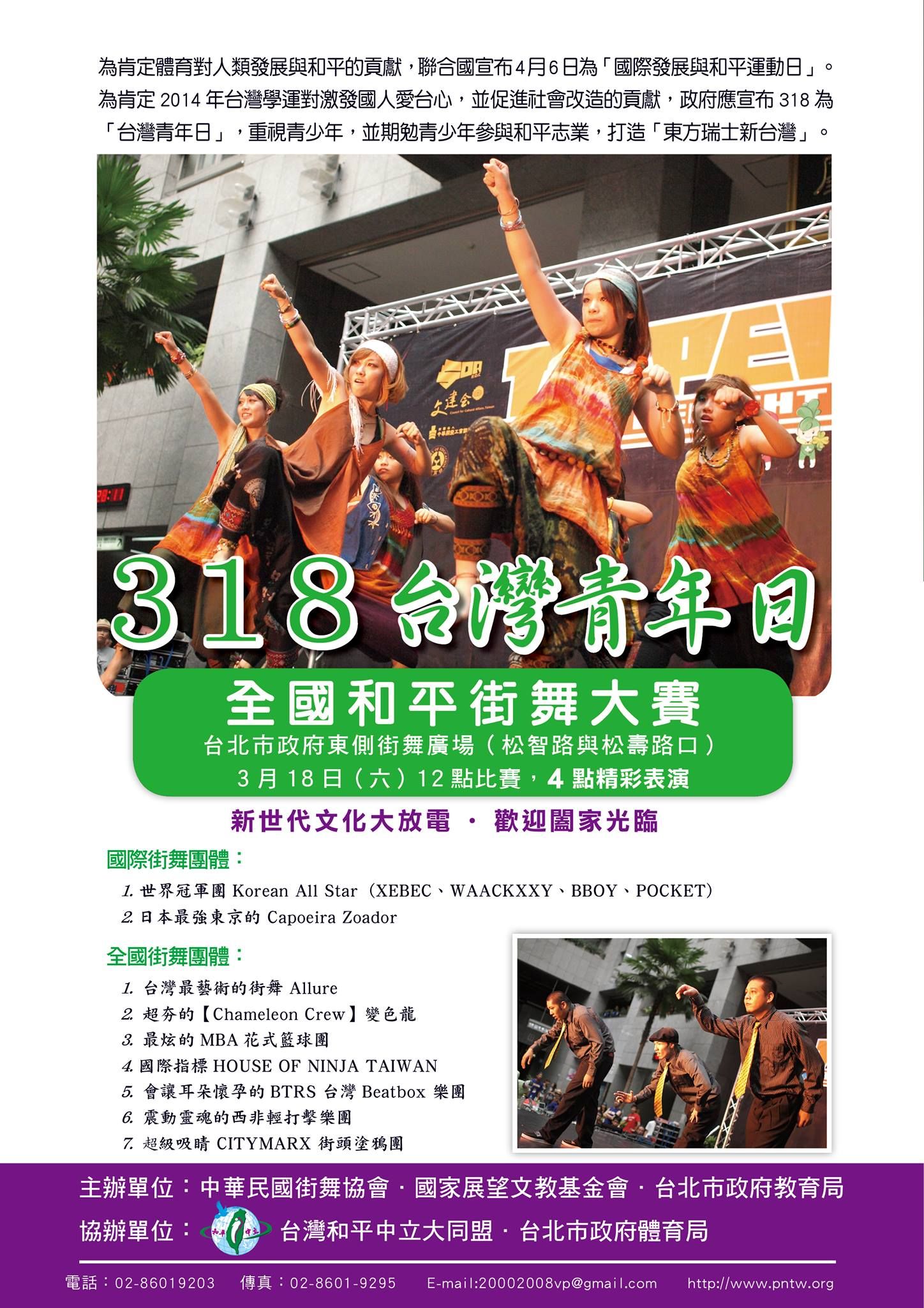 為肯定2014年台灣學運對激發國人愛台心,並促進社會改造的m貢獻,政府應宣佈318為台灣「青年日」,重視青少年,並期許青少年參與和平志業,打造「東方瑞士新台灣」。
