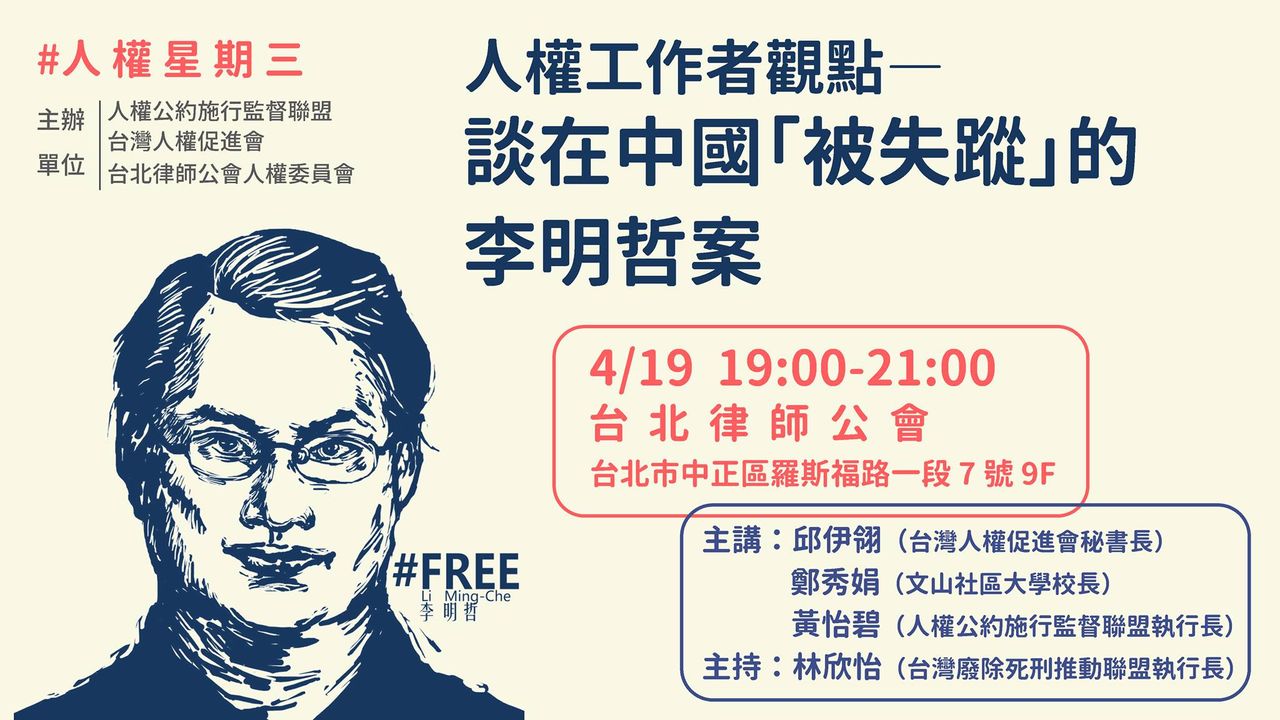 下週人權星期三,人權工作者和你一同討論關注李明哲被失蹤案。