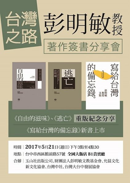 台灣之路 彭明敏教授 著作簽書分享會 《自由的滋味》、《逃亡》重版紀念分享 《寫給台灣的備忘錄》新書上市 時間:2017年5月21日(日)下午 3 :00 至 4:30 地點:台中市西區館前路57號全國大飯店B1貴賓廳
