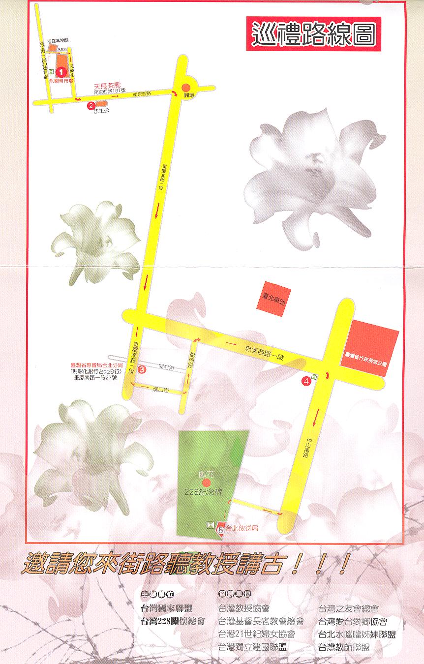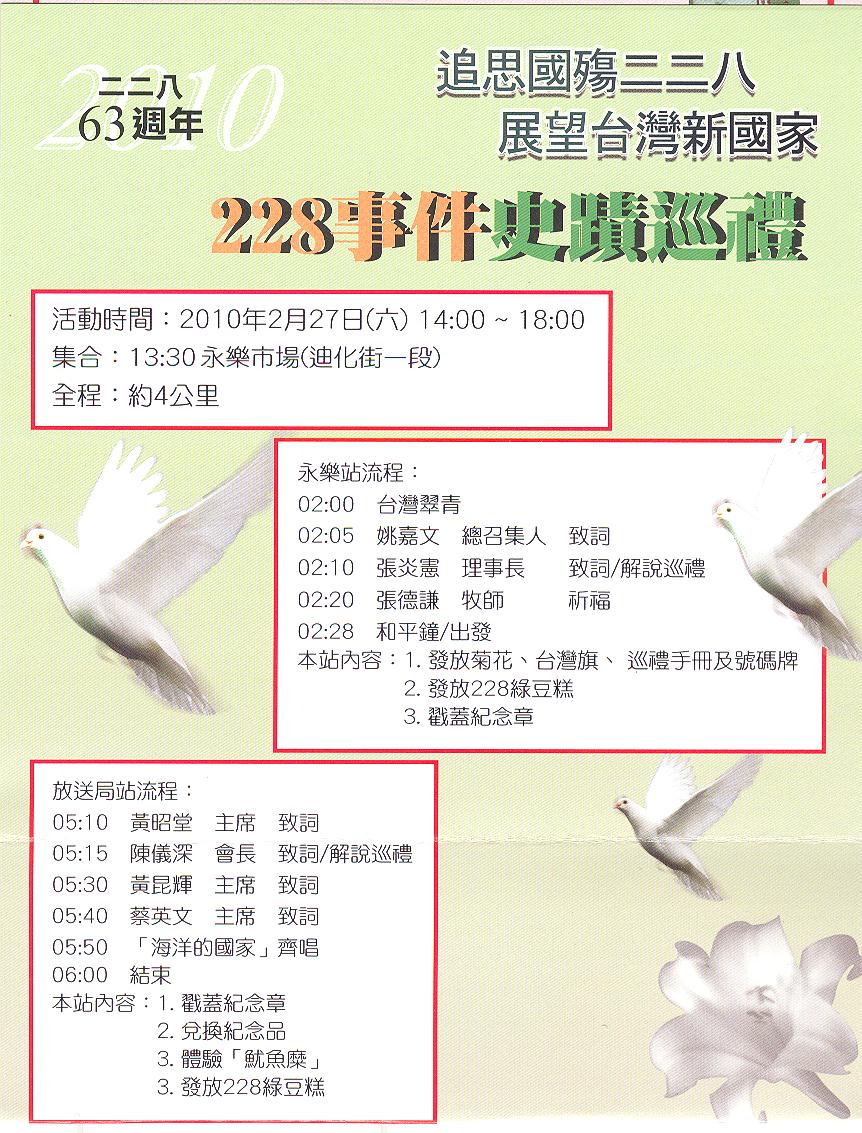 活動時間:2月27日星期六下午2-6點 集合:下午1點半 永樂市場 迪化街一段 全程約4公里 今年228台灣國家聯盟在2月27日,發起「追思二二八 展望台灣新國家」228事件史蹟巡禮活動 活動說明如附件所示,請您前來參與。