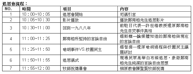 在鄭南榕先生為爭取言論自由殉道將近21周年之際,我們邀請所有堅持言論自由的志士與當時撰寫「台灣共和國新憲法草案」的作者—前駐日代表許世楷教授、新世代評論家楊斯棓醫師、以及向台中市長胡志強嗆聲的大學生楊智淵一起於追思會中探討鄭南榕所堅持的言論自由VS.校園民主議題,邀請您 蒞臨 採訪。