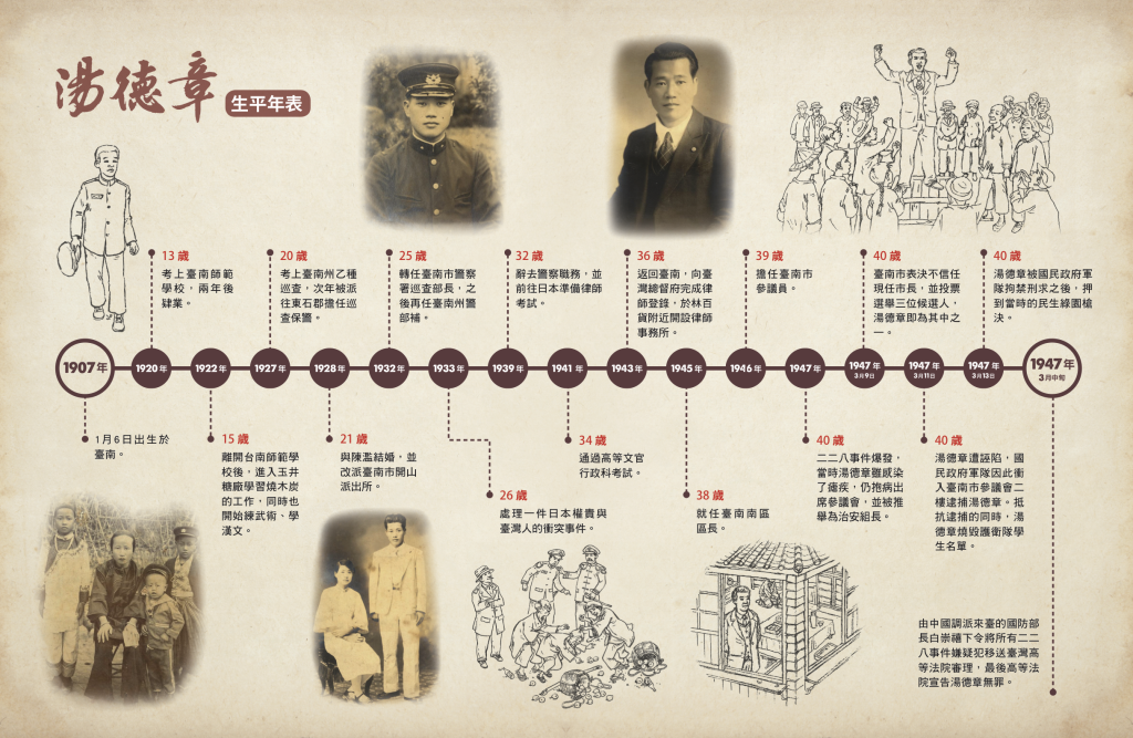 湯德章(1907年1月6日〜1947年3月13日),臺灣臺南人。曾任臺南州巡查,表現優異,但因非純日本人而受上級的歧視與壓力,於1939年辭去警官職務後,回到父親的故鄉東京,於東京中央大學深造,通過日本高等文官考試司法科及格,日本親友建議他留在日本取得更好的發展,但他反而決定返回臺灣,為臺灣人服務並照顧母親,並改回母姓湯。湯德章在臺南南門町定居,並於末廣町開業,成為臺南地區知名律師,常酌收廉價的訴訟費用,或義務辯護,幫助法律知識不足的臺灣人伸張正義,抵抗劣質日本人的欺凌,因此受到台南人尊敬與擁戴。