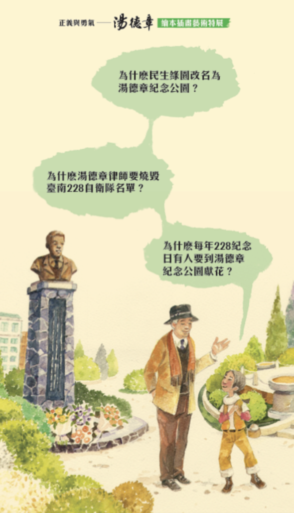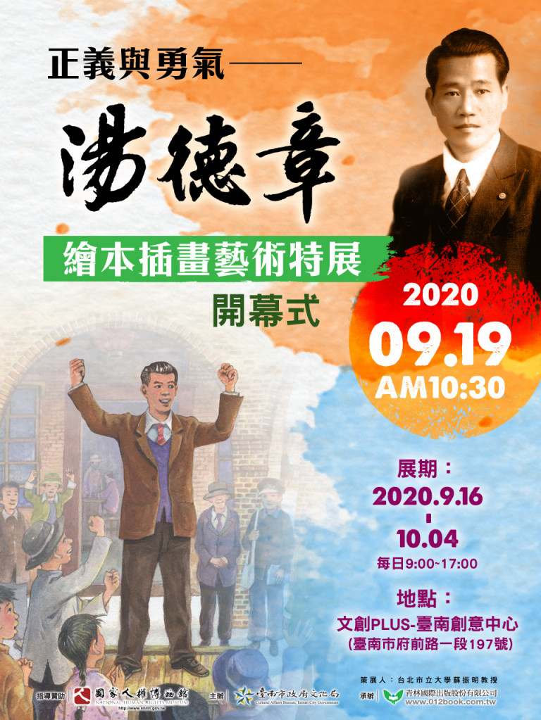 為感念湯德章律師於二二八事件期間,保護無數青年學子的生命與人權,他可說是正義與勇氣的化身,犧牲生命化為永恆,看顧著台灣百姓的生命安全,台南市政府文化局獲國家人權博物館指導贊助‚與青林國際出版公司共同出版《正義與勇氣─湯德章》繪本書,並9月19日上午10:30舉行繪本插畫藝術特展開幕式,當天下午2:00〜4:00還有蘇振明教授專題講座,主題為「正義與勇氣——湯德章與府城228的故事」,台南民眾請把握時間前往參觀。