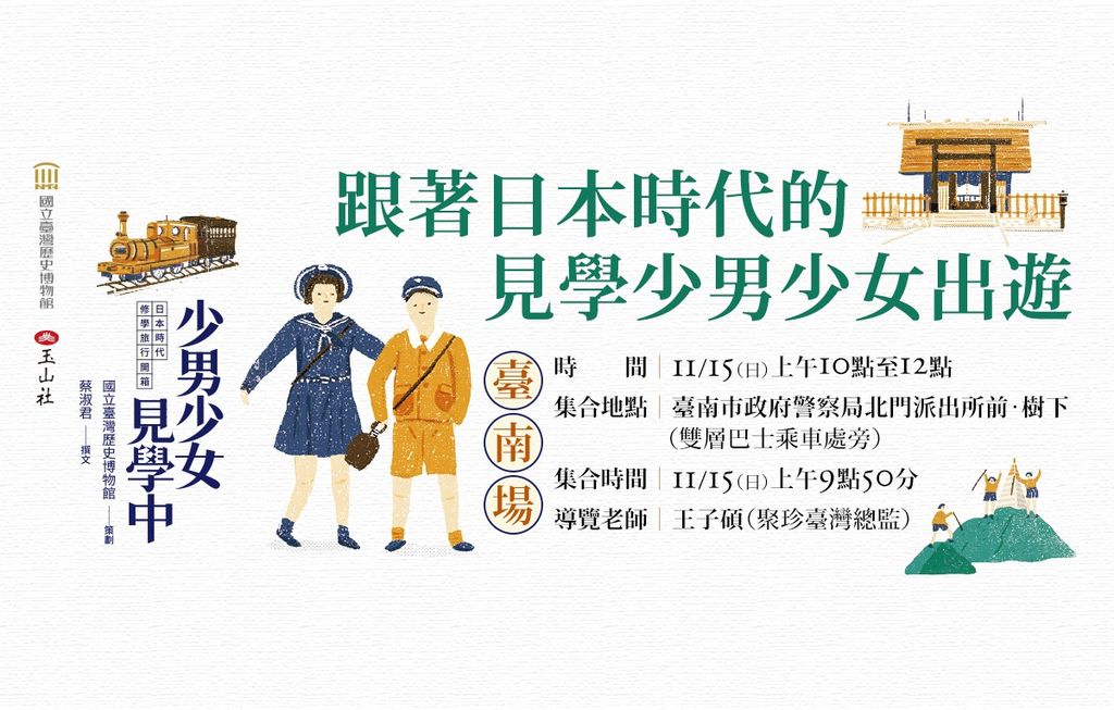 11/15(日)在臺南,11/22(日)在臺中,透過文史研究者──聚珍臺灣總監王子碩、臺中文史復興組合發起人格魯克的引領,實地開箱日本時代的修學旅行路線,跟著見學的少男少女出遊。