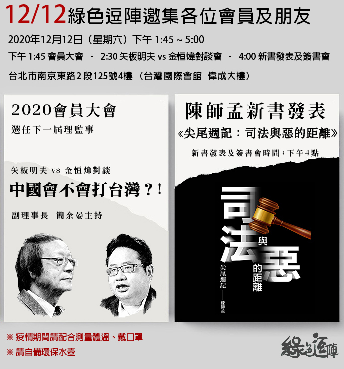 12/12 陳師孟新書發表、矢板明夫vs金恒煒對談「中國會不會打台灣?!」 |