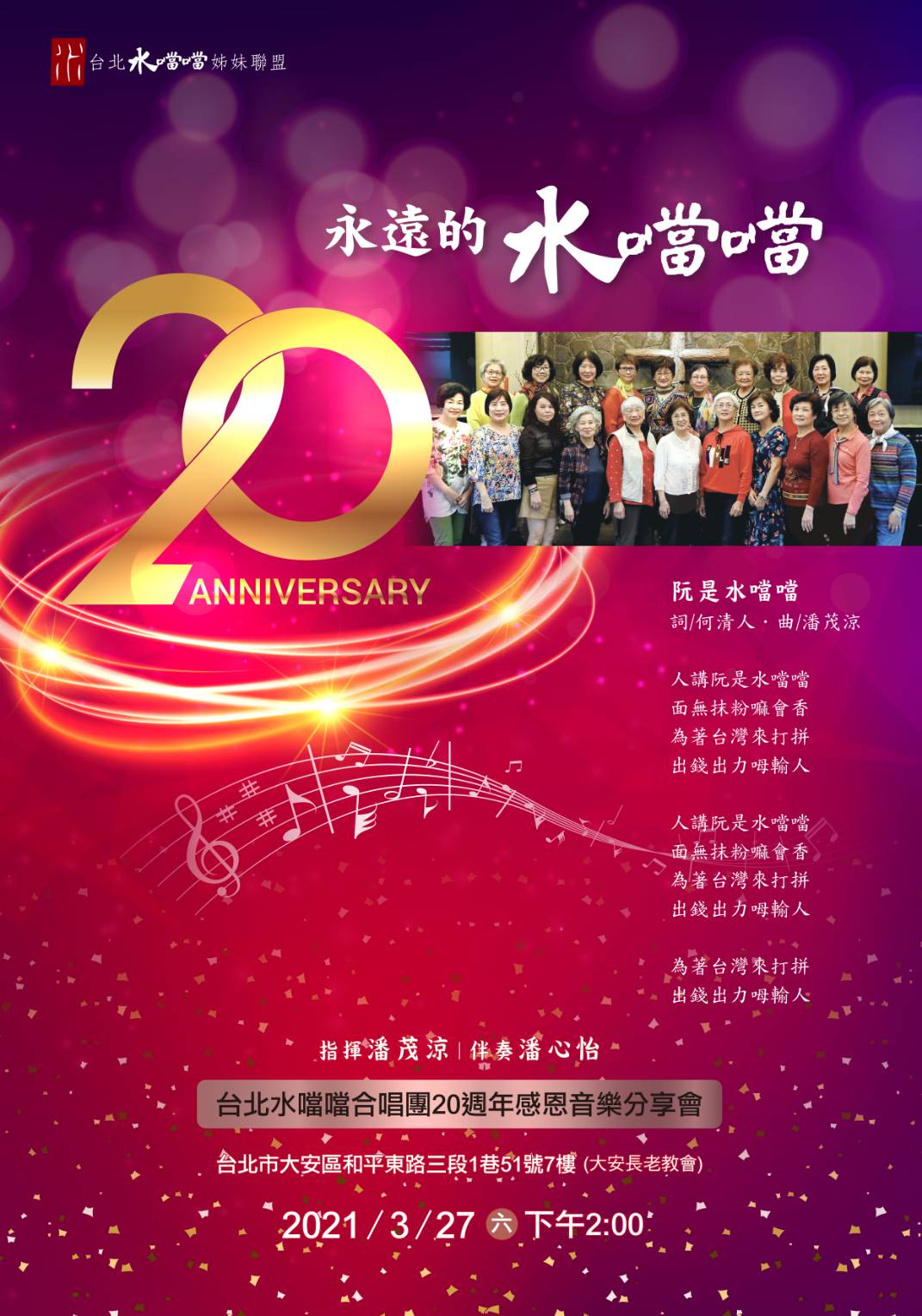 時間:2021/03/27(週六)下午2:00 地點:大安長老教會(台北市大安區和平東路三段1巷51號7樓) 台北水噹噹合唱團成立於2000年,20年來一路伴隨台灣民主成長,上山下海、無役不與,用珍貴的母語、熱誠的聲音歌頌台灣。 值此20週年,我們以感恩的心舉辦分享會。敬邀您蒞臨指導。
