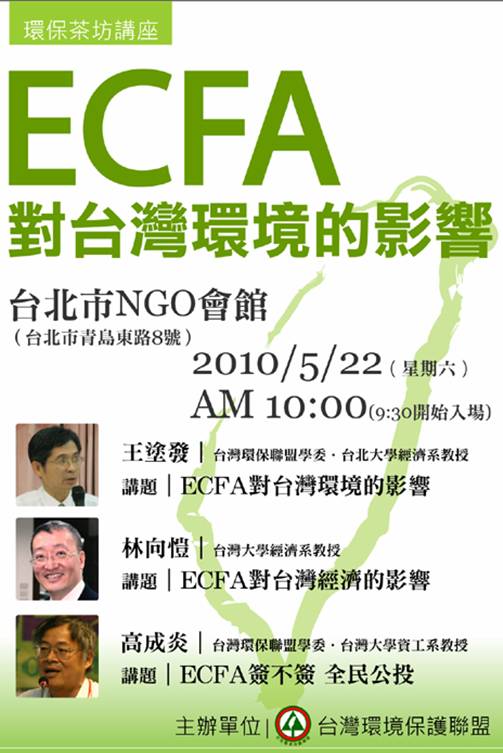 簽署ECFA不只對台灣經濟、產業造成影響,也將促進國內石化、塑化等高耗能、高污染產業發展,污染台灣生態環境,台灣環保聯盟特別邀請王塗發、林向愷、高成炎教授以環境、經濟、政策層面解析ECFA對台灣環境的影響,邀請您 5月22日(六)來到台北市NGO會館 共同關心與探討,歡迎踴躍參加。