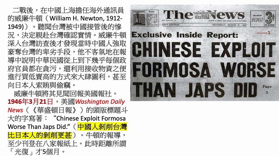 左:1946/3/21的《華盛頓日報》,頭版標題「中國人剝削台灣比日本人的剝削更甚CINESE EXPLOIT FORMOSA WORSE THAN JAPS DID」,簡報第42頁。右:1946/4/15的《匹茲堡新聞》,主標題「台灣的悲劇The Tragedy of Taiwan」,簡報第56頁。(點圖可放大觀看)
