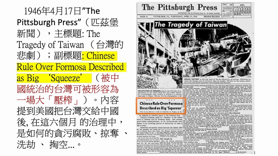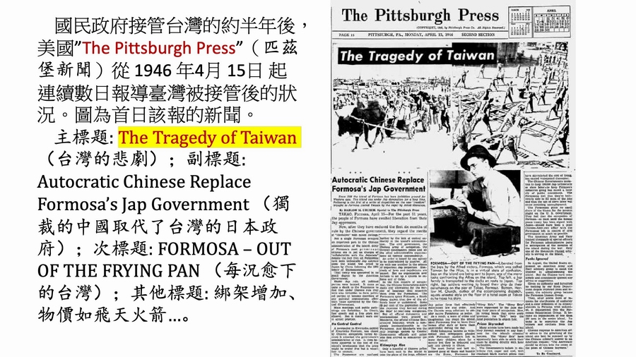 左:1946/4/17的《匹茲堡新聞》,繼續報導「台灣的悲劇The Tragedy of Taiwan」,簡報第57頁。右:1946/9/20的上海《僑聲報》社論,「美國人對日本太好了,僅僅投了兩顆原子彈。但是對台灣卻太狠了,把中國貪官投到台灣人。」簡報第58頁。(點圖可放大觀看)
