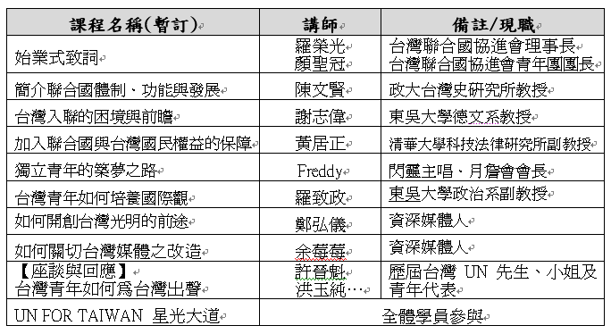 鑑於台灣UN青年的培養是持續推動「台灣加入聯合國運動」最重要的人力資產,也是珍貴的種籽,本會秉持此一宗旨和目標,期盼藉由研習營的舉辦,讓關心台灣,且有志於參與加入聯合國運動的青年朋友,透過兩天一夜課程的學習,以及創意發想的活動,從認識UN到實際參與台灣入聯國的公民運動。本研習營規劃以輕鬆、活潑的教學型態,配合團隊互助、行動與創意,讓學員在生活化的環境中,共同體認台灣入聯國的遠景和價值。
