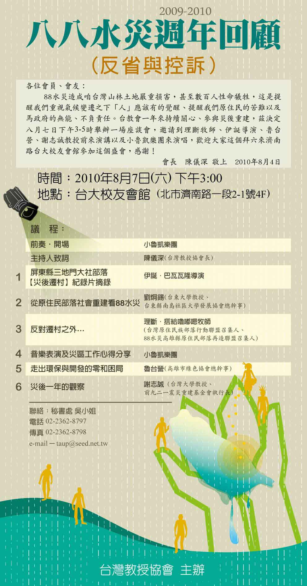 88水災造成咱台灣山林土地嚴重損害,甚至數百人性命犧牲,這是提醒我們重視氣候變遷之下「人」應該有的覺醒、提醒我們原住民的苦難以及馬政府的無能、不負責任。台教會一年來持續關心、參與災後重建,茲決定八月七日下午3-5時舉辦一場座談會,邀請到理斷牧師、伊誕導演、魯台營、謝志誠教授前來演講以及小魯凱樂團來演唱,歡迎大家這個拜六來濟南路台大校友會館參加這個盛會,感謝!