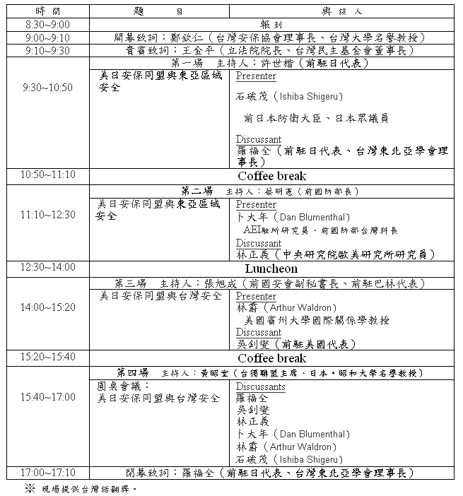 「美日安保同盟五十年與台灣安全」國際研討會議程