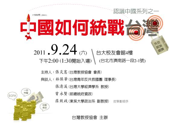 中國如何統戰台灣 時 間:2011年9月24日(六) 下午2:00 (1:30開始入場) 地 點:台大校友會館4樓 (台北市濟南路一段2-1號) 主持人:張炎憲 (台灣教授協會 會長) 與談人:林保華 (台灣青年反共救國團 理事長) 張清溪 (台灣大學經濟學系 教授) 曾永賢 (前總統府資政) 羅致政 (東吳大學政治系 副教授) 按筆劃順序 台灣教授協會 主辦