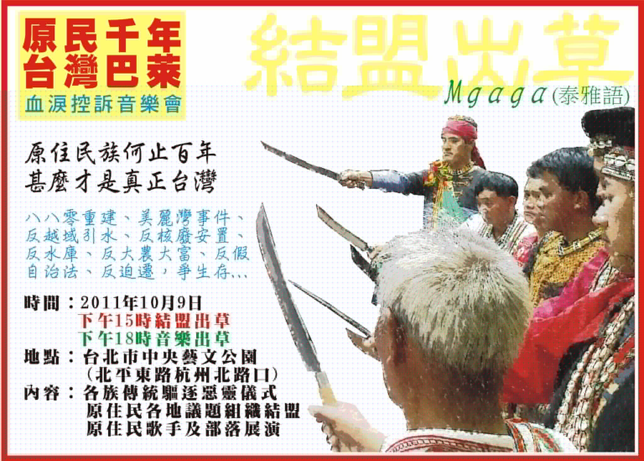 套用賽德克巴萊的說法,我不需要你把我們當人看,因為那不是我們成為"真正的人"的方式!我們串聯邀請近年來原住民族各地方議題組織,在10月9日辦理【原民千年、台灣巴萊】結盟出草音樂會,對於不公義的殖民國家惡靈,透過驅逐儀式來表達不滿,也在此時進行結盟,告訴政府我們不是諸多個案,而是國家錯誤統治而造成原住民族的許多血淚與苦難。