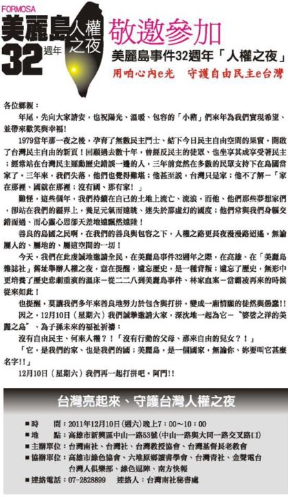 敬邀 參加美麗島事件32週年『人權之夜』 活動日期:2011年12月10日(星期六)~時間:19:00-22:00 活動地點:高雄市新興區中山一路53號(中山路與大同路口) 主辦單位:台灣南社 台灣社 台灣教授協會 台灣基督長老教會 協辦單位:高雄市綠色協會 六堆原鄉讀書學會 台灣青社 金聲電台 臺灣人俱樂部 綠色鬥陣 南方快報 聯絡電話:07-2828899 聯絡人:台灣南社秘書處