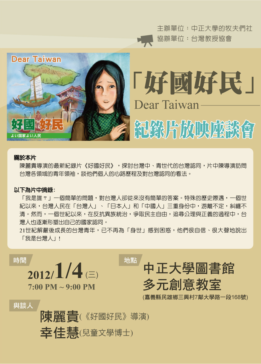 陳麗貴導演的最新紀錄片《好國好民》,探討台灣中、青世代的台灣認同,片中陳導演訪問台灣各領域的青年領袖,談他們個人的心路歷程及對台灣認同的看法。