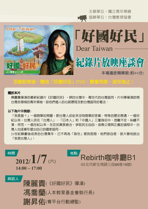 (本場播放精華版約44分,活動結束後,贈送「好國好民」DVD,數量有限,送完為止!)