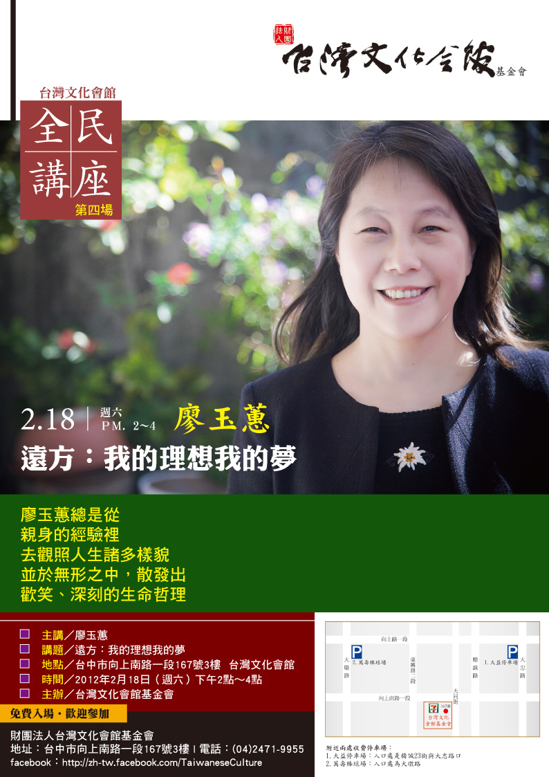 台灣文化會館第四場演講: 主講/廖玉蕙 講題/遠方──我的理想我的夢 地點/台中市向上南路一段167號3樓(7-11樓上) 台灣文化會館 時間/2012年2月18日(週六)下午2點~4點 主辦/台灣文化會館基金會