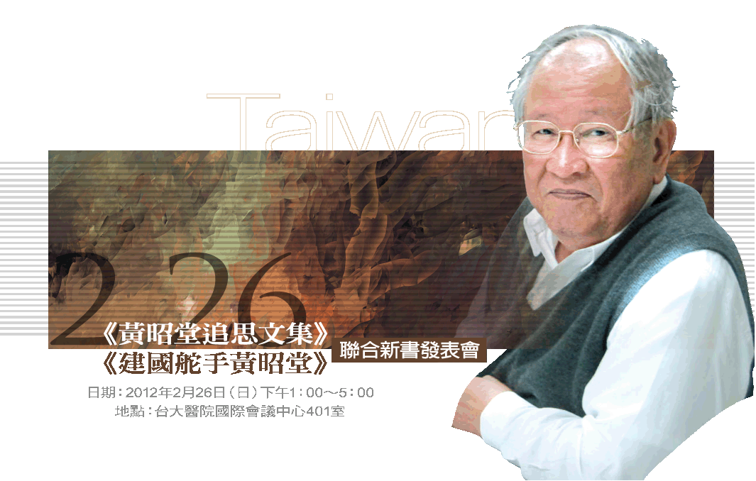 值此228事件六十五週年前夕,本會將與台獨聯盟聯合舉辦《建國舵手黃昭堂》與《黃昭堂追思文集》新書發表會暨座談會,訂於2012年2月26日下午兩點,假台大醫院國際會議中心(台北市徐州路2號4樓)舉行,竭誠邀請大家一起來追念黃昭堂主席一生為台灣獨立運動的付出,展現台灣人歷經二二八苦難後的覺醒與建國意志。
