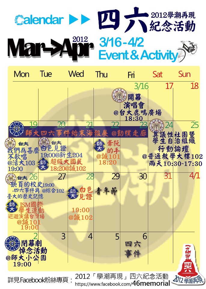 更多活動詳情,請至 2012「學潮再現」四六紀念活動FB專頁 或至 2012四六事件紀念活動24屆台大學生會網站 查看