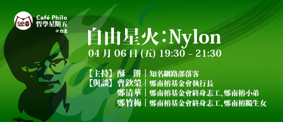 本周五,是鄭南榕先生逝世 23 周年前夕,在這個特別的夜裡,我們將邀請鄭南榕基金會執行長曹欽榮先生與鄭南榕先生的弟弟鄭清華先生、鄭南榕先生的獨生女鄭竹梅小姐,透過他們對鄭南榕先生的介紹,與我們一同探討台灣目前的「自由」概況。23 過去了,多少前輩披荊斬棘地開創出民主的道路,而今,台灣真的已擁有居住、生存乃至於言論的百分百自由嗎?本周五晚間七點半,Café Philo哲學星期五,邀您一同省思自由的真諦。
