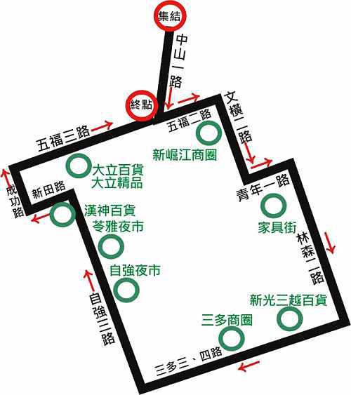 中山一路(言論廣場)─→(左轉)五福四路‧新崛江商圈─→(右轉)文橫一路‧新崛江商圈─→(左轉)青年一路‧家具街─→(右轉)林森二路─→(右轉)三多三路‧新光三越百貨、SOGO百貨─→(直行)三多四路‧三多商圈─→(右轉)自強三路‧自強商圈─→(右轉)新田路‧漢神商圈─→(右轉)成功一路‧大立商圈─→(右轉)五福三路─→中山一路(城市光廊)