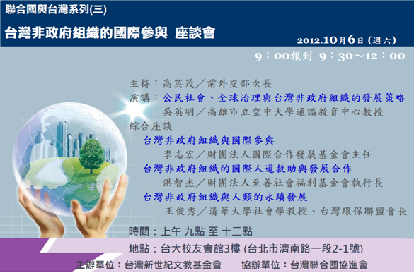 10月13日(週六) 「聯合國、台灣與國際政經發展」座談會