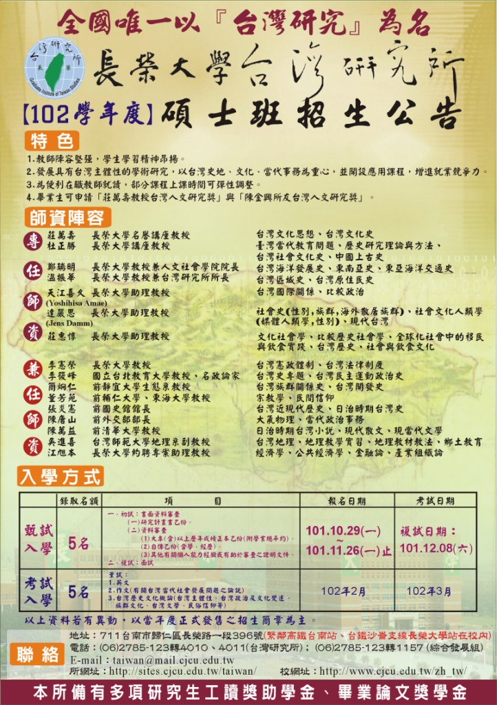 10/29-11/26 長榮大學台灣研究所碩士班甄試報名