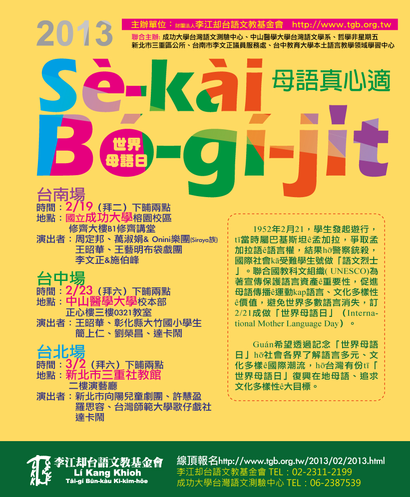 李江却台語文教基金會為紀念今年的「世界母語日」,延續自2008年起的一連串活動,將聯合哲學非星期五、新北市向陽兒童劇團、台灣師範大學歌仔戲社、中山醫學大學台灣語文學系、台中教育大學本土語言教學領域學習中心、成功大學台灣語文測驗中心、台南市李文正議員服務處、Siraya族Onini樂團、王藝明布袋戲團等團體,於「世界母語日」前後,於台南、台中、台北(按舉辦順序)舉行一系列活動,希望引發社會各界重視在地母語的傳承。