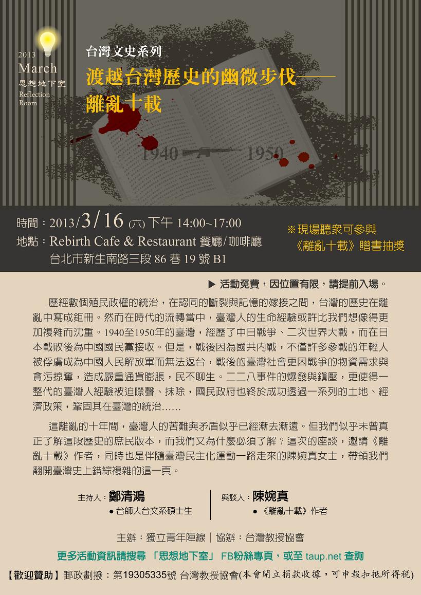 這離亂的十年間,臺灣人的苦難與矛盾似乎已經漸去漸遠。但我們似乎未曾真正了解這段歷史的庶民版本,而我們又為什麼必須了解?這次的座談,邀請《離亂十載》作者,同時也是伴隨臺灣民主化運動一路走來的陳婉真女士,帶領我們翻開臺灣史上錯綜複雜的這一頁。
