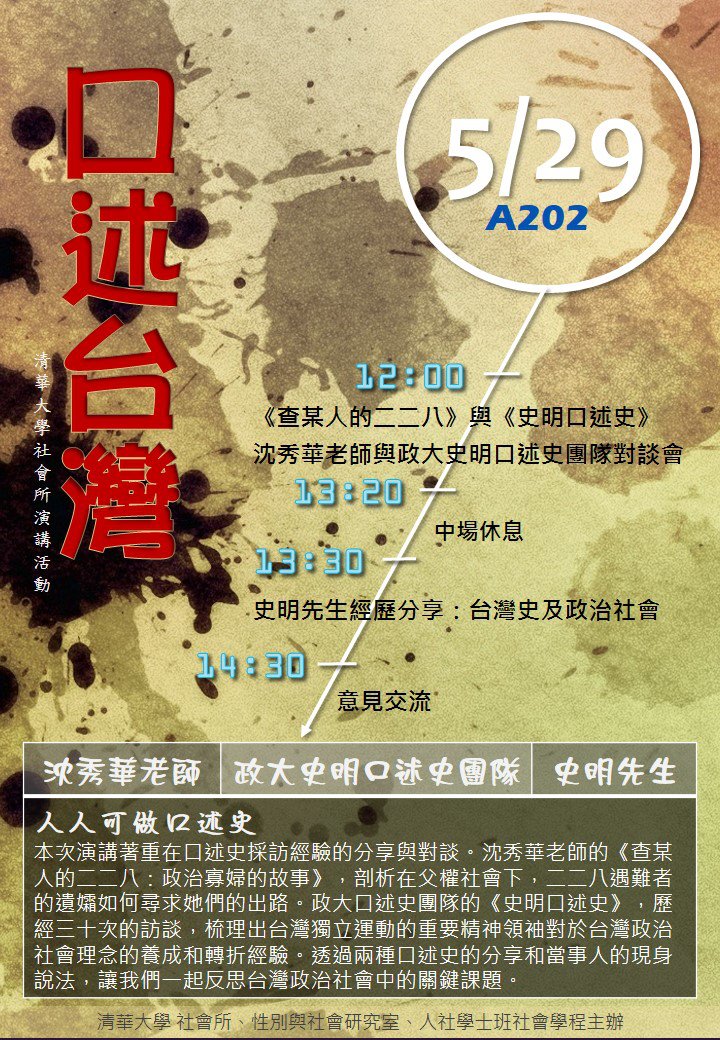 本次演講著重在口述史採訪經驗的分享與對談。沈秀華老師的《查某人的二二八:政治寡婦的故事》,剖析在父權社會下,二二八遇難者的遺孀如何尋求她們的出路。口述史團隊的《史明口述史》,歷經三十次的訪談,梳理出台灣獨立運動的重要精神領袖對於台灣政治社會理念的養成和轉折經驗。透過兩種口述史的分享和當事人的現身說法,讓我們一起反思台灣政治社會中的關鍵課題。