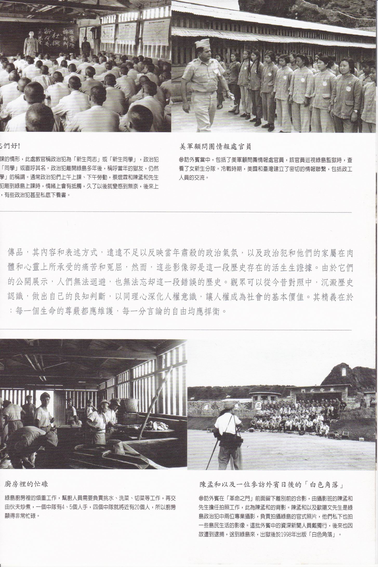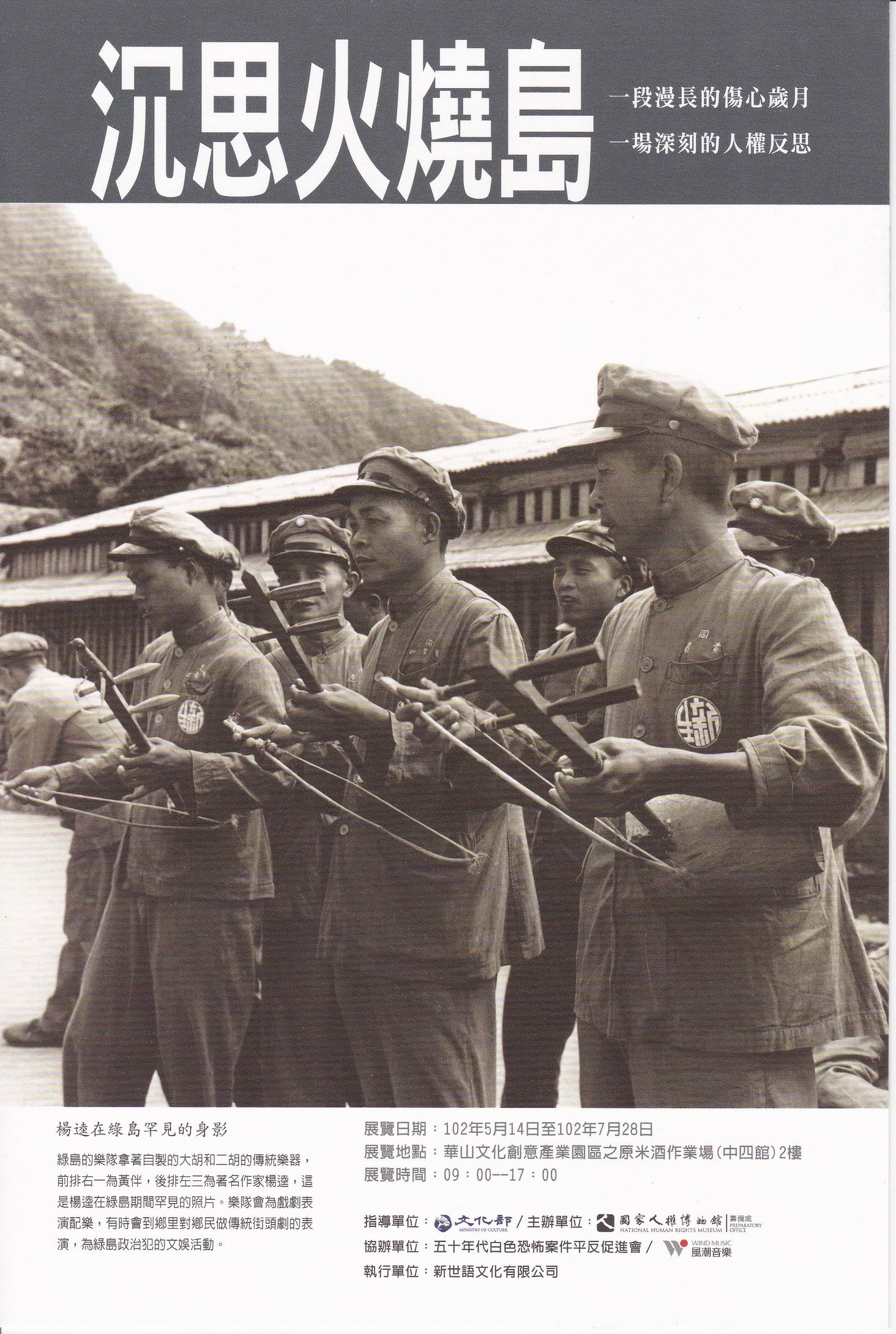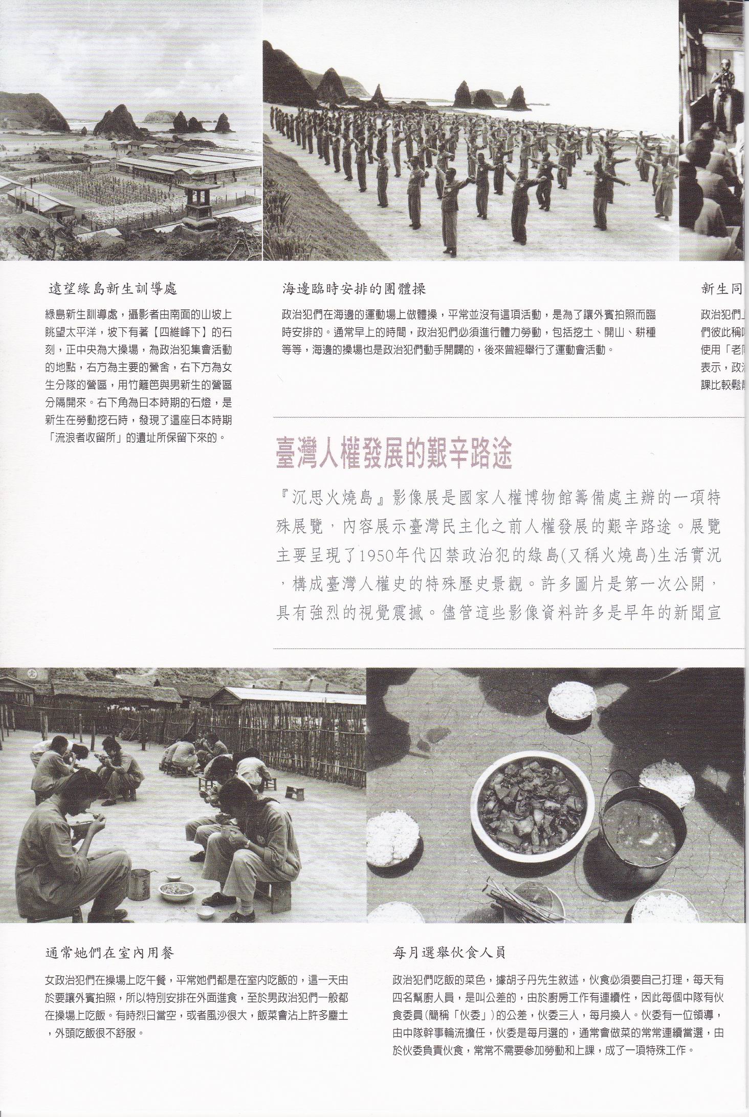 「沉思火燒島」影像展 是國家人權籌備處主辦的一項特殊展覽,內容展示台灣民主化之前人權發展的艱辛路途。展覽主要呈現了1950年代囚禁政治犯的綠島(又稱火燒島)生活實況,構成台灣人權史的特殊歷史景觀。許多圖片是第一次公開,具有強烈的視覺震撼。儘管這些影像資料許多是早年的新聞宣傳品,其內容和表述方式,遠遠不足以反映當年肅殺的政治氣氛,以及政治犯和他們的家屬在肉體和心靈上所承受的痛苦和冤屈,然而,這些影像卻是這一段歷史存在的活生生證據。由於它們的公開展示,人們無法迴避,也無法忘卻這一段錯誤的歷史。觀眾可以從今昔對照中,沉澱歷史認識,做出自己的良知判斷,以同理心深化人權意識,讓人權成為社會的基本價值。其精義在於:每一個生命的尊嚴都應維護,每一分言論的自由均應捍衛。
