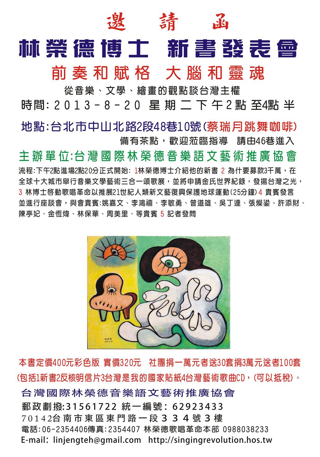 1.新書發表會8月16日(五)下午4:00~6:00 賦格和前奏 大腦與靈魂--由音樂`文學和繪畫觀點看台灣主權