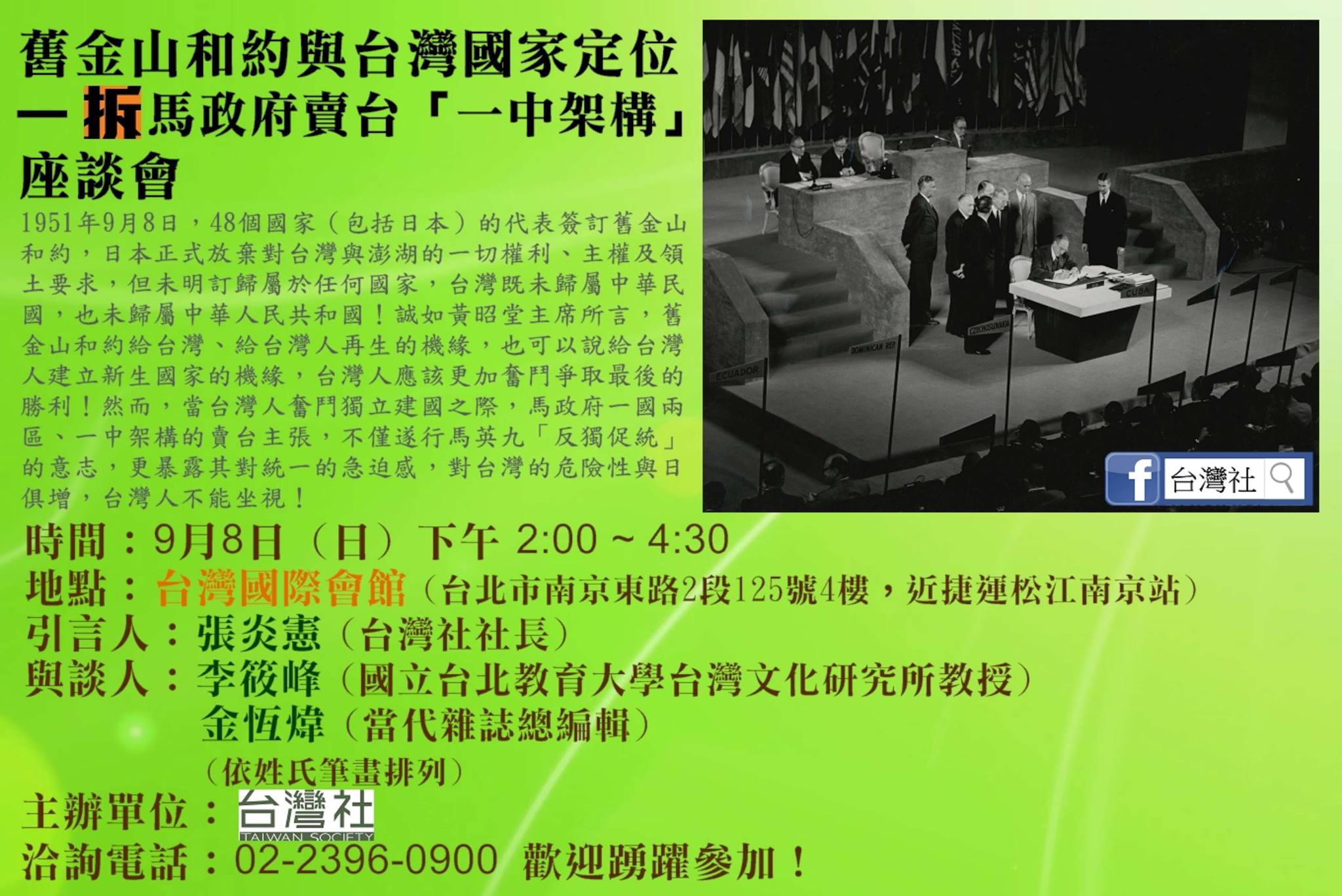 舊金山和約與台灣國家定位—拆馬政府賣台「一中架構」座談會 【時間】9月8日 (日) 下午2:00 ~ 4:30 【地點】台灣國際會館(台北市南京東路2段125號4樓) 【引言】張炎憲∣台灣社社長 【與談】李筱峰∣國立台北教育大學台灣文化研究所教授 【與談】金恒煒∣《當代》雜誌總編輯 今年是舊金山和約62週年,歡迎作伙來瞭解!