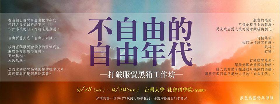 兩岸服務貿易協議的黑箱簽訂,以「自由貿易」之名,圖利少部份優勢企業與資本家,將更多的台灣人民生存權碾碎在開放競爭的巨輪下。希望透過本工作坊,讓關心服貿協議的青年,深入了解服貿協議對台灣未來幾十年的重大衝擊及深遠影響,藉此凝聚青年對服貿議題的共識,同時擬訂具體因應戰略、運動策略,並規劃未來服貿協議的訪調工作。
