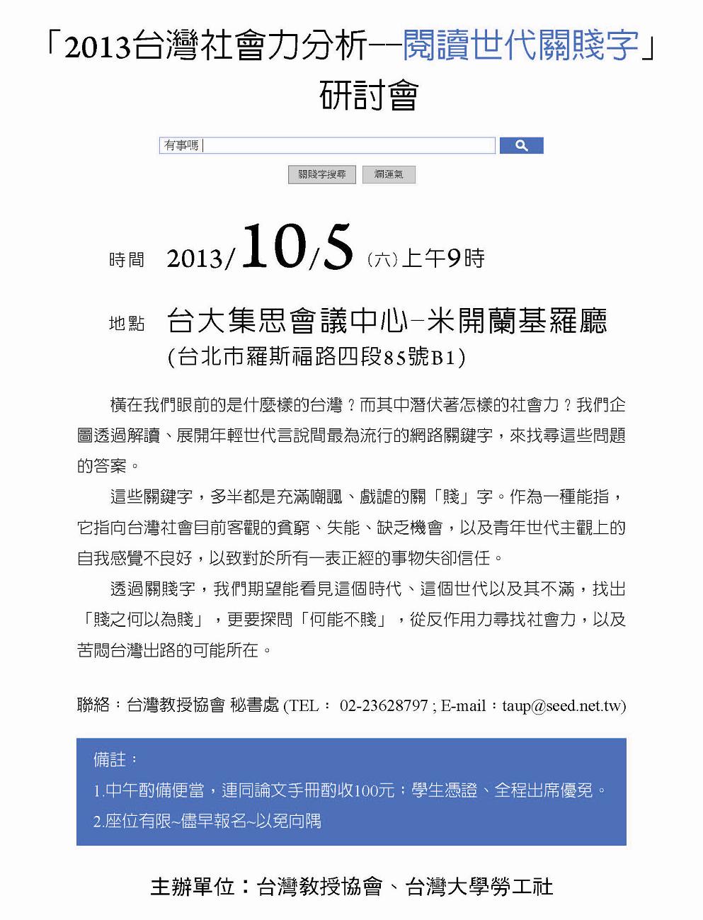 10/05 「2013台灣社會力分析-閱讀世代關賤字」研討會