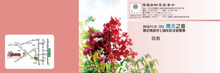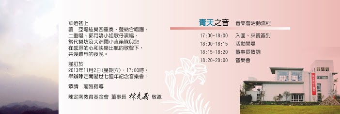 華燈初上 讓 亞堤絃樂四重奏、聲納合唱團、 二重唱、郭月嬌小姐歌仔演唱、 當代樂坊及大洲國小直笛隊與您 在感恩的心和快樂出航的歌聲下, 共渡難忘的夜晚。 謹訂於 2013年11月2日(星期六),17:00時, 舉辦陳定南逝世七週年紀念音樂會。 恭請 蒞臨指導 陳定南教育基金會 董事長 林光義 敬邀