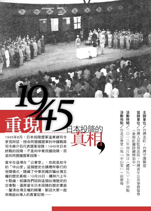 當年在這場在「公會堂」,也就是如今的「中山堂」這個歷史古蹟裡所舉行的受降儀式,隱藏了中華民國詐騙台灣主權的歷史真相。10月26日,禮拜六上午十點鐘,就讓我們回到這個台灣歷史的交會點,還原當年日本投降的歷史畫面,釐清台灣主權的歸屬。歡迎大家一起來喚起台灣人的真實記憶……