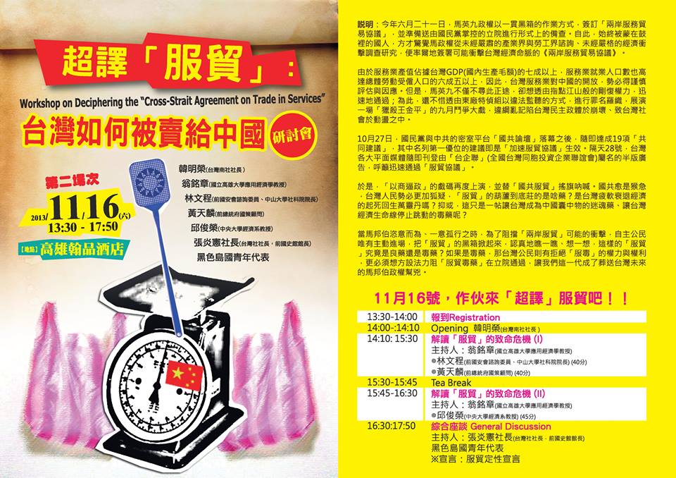 ※ 說明:今年六月二十一日,馬英九政權以一貫黑箱的作業方式,簽訂「兩岸服務貿易協議」,並準備送由國民黨掌控的立院進行形式上的備查。自此,始終被蒙在鼓裡的國人,方才驚覺馬政權從未經嚴肅的產業界與勞工界諮詢、未經嚴格的經濟衝擊調查研究,便率爾地簽署可能衝擊台灣經濟命脈的《兩岸服務貿易協議》。