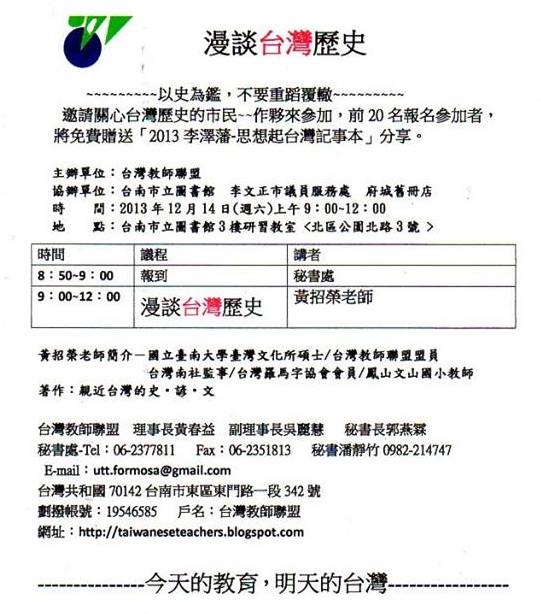 邀請關心台灣歷史的市民~~作夥來參加,前20名報名參加者,
