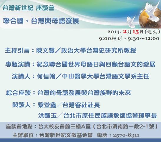 聯合國、台灣與母語發展 座談會 時間:2014年 2月15日(週六)9:00報到,9:30〜12:00 地點:台大校友會館三樓A室(台北市濟南路一段2-1號) 主辦:台灣新世紀文教基金會