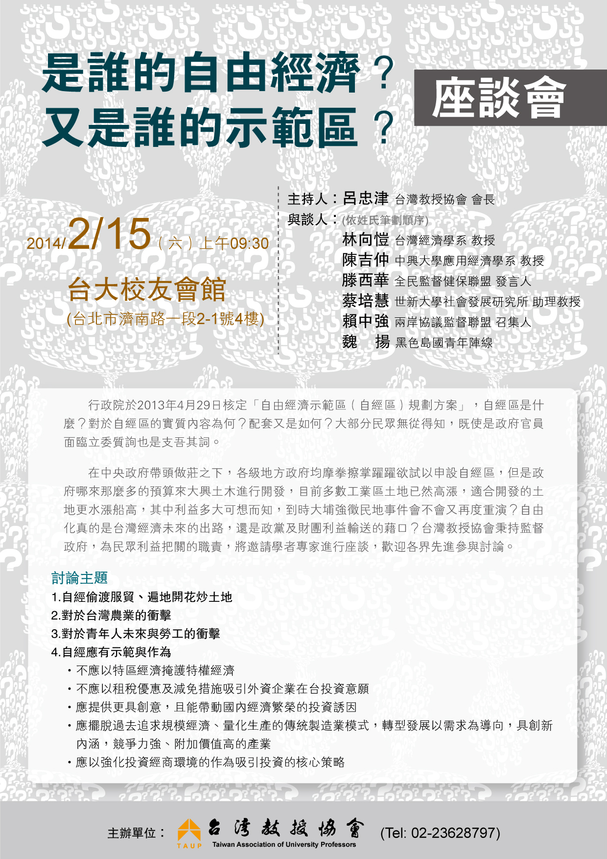 在中央政府帶頭做莊之下,各級地方政府均摩拳擦掌躍躍欲試以申設自經區,但是政 府哪來那麼多的預算來大興土木進行開發,目前多數工業區土地已然高漲,適合開發的土地更水漲船高,其中利益多大可想而知,到時大埔強徵民地事件會不會又再 度重演?自由化真的是台灣經濟未來的出路,還是政黨及財團利益輸送的藉口?台灣教授協會秉持監督政府,為民眾利益把關的職責,將邀請學者專家進行座談,歡 迎各界先進參與討論。