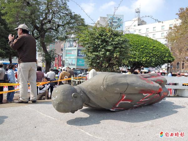 台南市湯德章紀念公園內的孫文銅像,昨天下午被公投護台灣聯盟成員以尼龍繩強行拉倒。(記者王俊忠攝)